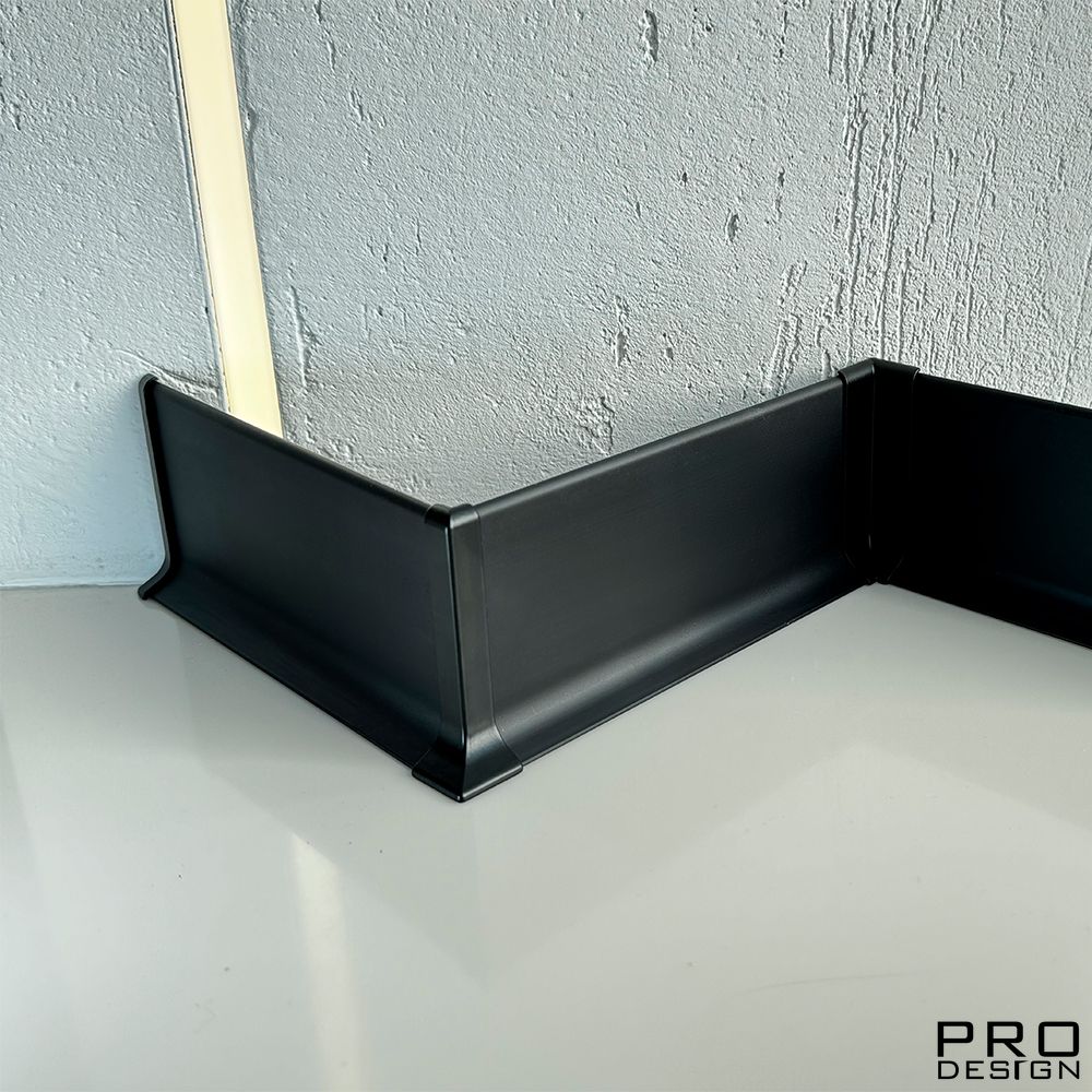 Накладной пристеночный плинтус SYMETRIC L-образный анодированный черный – отличное решение для современных интерьеров, помещений с повышенной влажностью и высокой проходимостью. Плинтус закрывает не эстетичный стык между стеной и полом, а также является декоративным элементом интерьера, предупреждает случайное повреждение и загрязнение стеновой отделки.