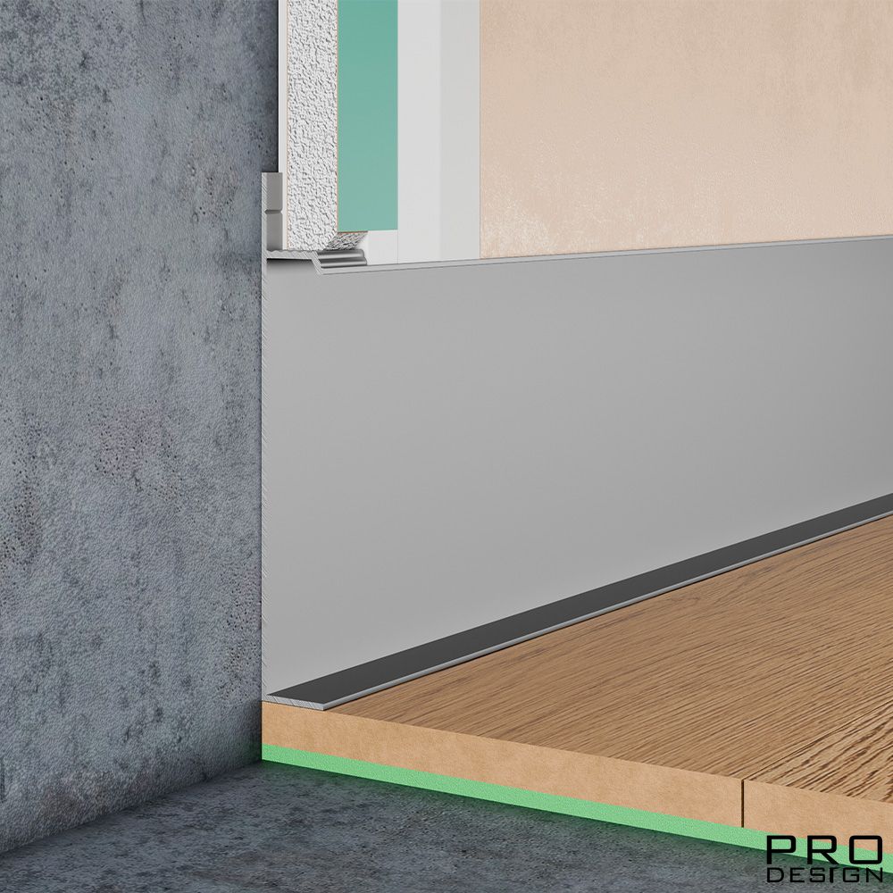 Плинтус скрытого монтажа PRO DESIGN UNIVERSALE 235 анодированный не подвержен коррозии, устойчив к износу, может использоваться в помещениях с повышенной влажностью и высокой проходимостью. Модель прекрасно подходит для гостиничного холла и коридора, залов ресторанов, жилых комнат, ванной и кухни в современном стиле.