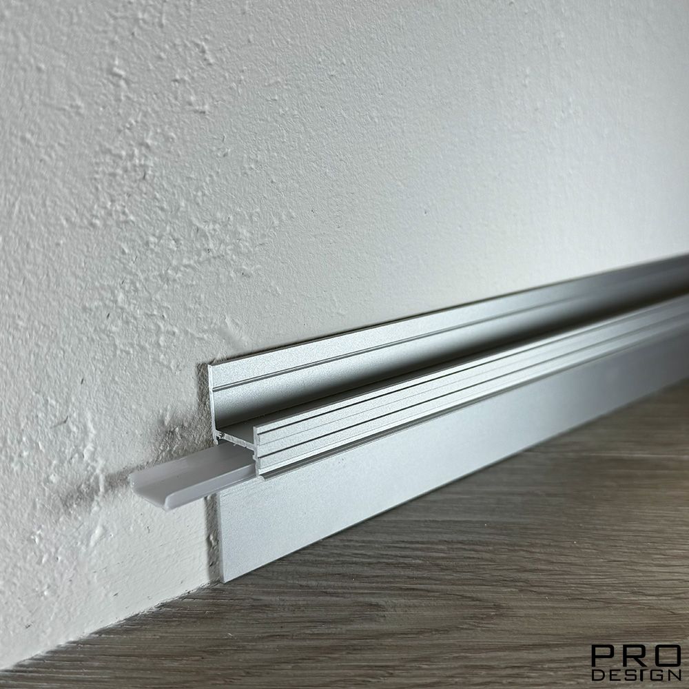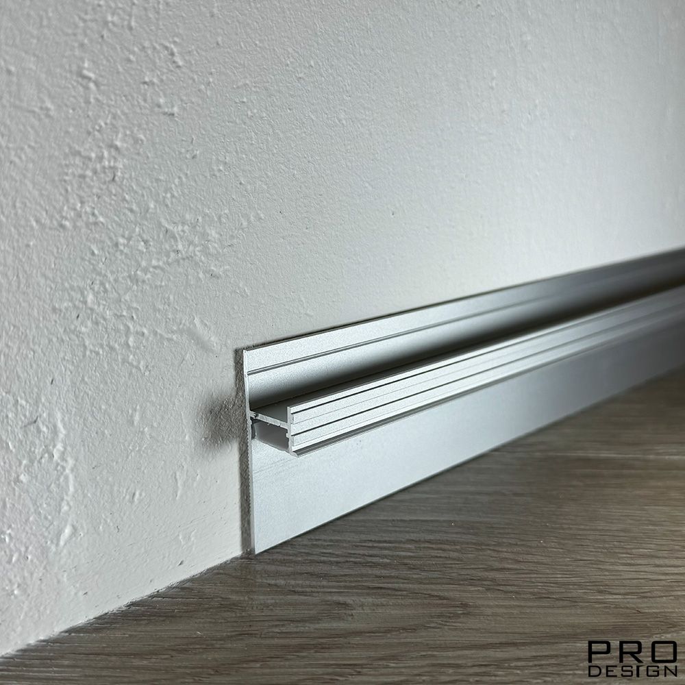 Теневой плинтус скрытого монтажа Pro Design из алюминия встраиваемый в стену, имеет большое количество применения, позволяет создать эффект парящей стены.