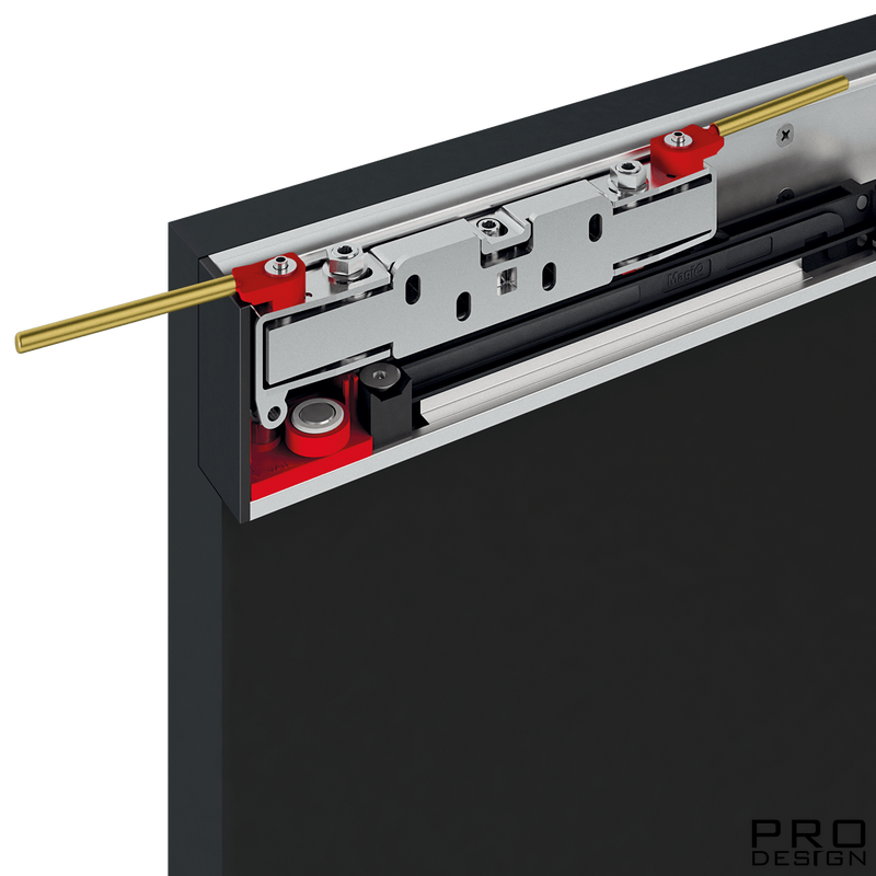 Высокопроизводительная раздвижная система оснащена амортизаторами, позволяющими плавно тормозить как при открытии, так и при закрытии. Скользящая направляющая скрыта от глаз как при открытой, так и при закрытой двери.