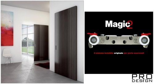Cистема MAGIC 2, позволяет добиться любого типа регулировки: по вертикали и горизонтали для компенсации любых неровностей в стене. Эти операции можно проводить, не открывая дверь, как это было в предыдущей модели. Оснащена двумя новыми элементами, обеспечивающими обязательную защиту двери от открывания. В эти новые элементы были вставлены два предохранительных стержня, которые позволяют легко поворачивать упоры без помощи каких-либо инструментов. Новые нижние колесики имеют запатентованную подвеску и имеют больший диаметр, подшипники и стальные пальцы. Резиновое покрытие также было увеличено вдвое, чтобы повысить прочность и плавность колес. Еще одним важным нововведением является установка двух увеличенных фиксированных пружин, которые позволяют смягчить движение двери до 40 кг.